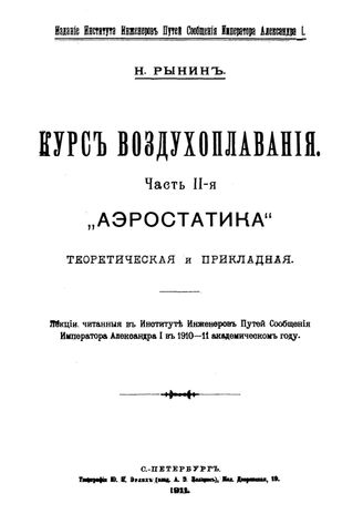 Курс воздухоплавания : лекции, читан. в Ин-те инженеров путей сообщения Императора Александра I в 1910-11 академ. г. / Н. Рынин. - СПб. : Тип. Ю. Н. Эрлих, 19 - .Ч. 2 : Аэростатика теоретическая и пркладная. - 1911. - 151 с. : ил. + 5 л. табл. - Б. ц.