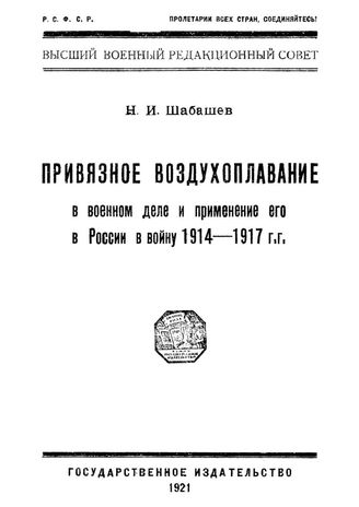 Шабашев Н.И. Привязное воздухоплавание в военном деле и применение его в России в войну 1914-1917 гг. - М., 1921.