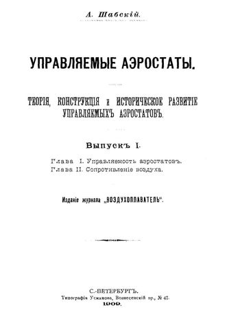 Управляемые аэростаты. Теория, конструкция и историческое развитие управляемых аэростатов / А. Шабский. - СПб. : Тип. Усманова, 19 - . - (Издание журнала "Воздухоплаватель"). Вып. 1 : Глава 1. Управляемость аэростатов. Глава 2. Сопротивление воздуха. - 1909. - 59 с. : ил. - Б. ц.