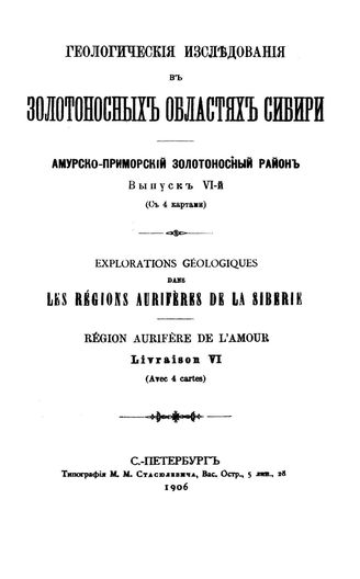Геологические исследования в золотоносных областях Сибири. Амурско-Приморский золотоносный район. - СПБ. : Тип. М. М. Стасюлевича, 19 - . Вып. 6. - 1906. - 104 с. + 3 л. карт. - Тираж не указ. - Б. ц.