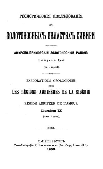 Геологические исследования в золотоносных областях Сибири. Амурско-Приморский золотоносный район. - СПБ. : Тип. М. М. Стасюлевича, 19 - . Вып. 9. - 1908. - 73 с. + 1 л. карт. - Библиогр. в подстроч. примеч. - Тираж не указ. - Б. ц.