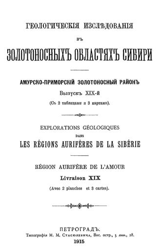 Геологические исследования в золотоносных областях Сибири. Амурско-Приморский золотоносный район. Вып. 19. - СПб., 1915.