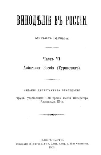 Виноделие в России / историко-стат. очерк. Часть 6 : Азиатская Россия (Туркестан) : издание департамента земледелия, 1903. - 261 с.