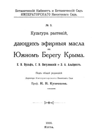 Вульф Е.В. Культура растений, дающих эфирные масла на Южном Берегу Крыма / Е. В. Вульф, Г. В. Пигулевский, Э. А. Альбрехт , 1916. - 45.