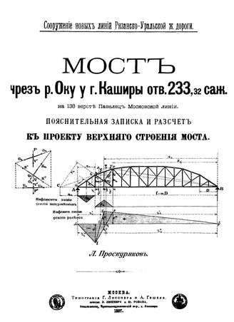 Проскуряков Л. Мост через р. Оку у г. Каширы отв. 233,32 саж. на 138 верст Павелец-Московской линии : пояснительная записка и расчет к проекту верхнего строения моста / Л. Проскуряков, 1897. - 132 с.
