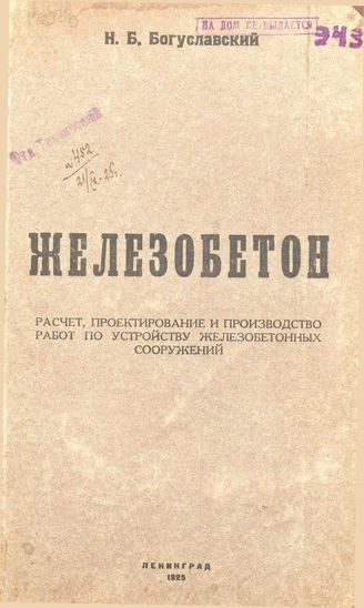 Богуславский Н. Б. Железобетон. Расчет, проектирование и производство работ по устройству железобетонных сооружений. - Ленинград, 1925.