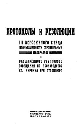 Протоколы и резолюции III всесоюзного съезда промышленности строительных материалов расширенного группового совещания по производству красного кирпича при стомбюро. - М., 1925.
