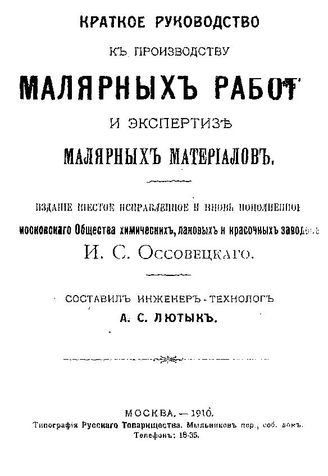 Краткое руководство к производству малярных работ и экспертиз малярных материалов / сост. инженер-технолог А.С. Лютык, 1910. - 157.