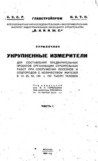 Укрупненные измерители для составления предварительных проектов организации строительных работ при сооружении поселков и соцгородов с количеством жителей в 10,25,50,100 и 150 тысяч человек : справочник. Часть I / под ред. инж. Б.П. Горбушина зам. директора ВНИИЖС'а по научной части. - 39.