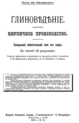 Белавенец М.И. Глиноведение. Кирпичное производство. Обжигание сырца-кирпича дровами в напольных печах. - СПб., 1905.