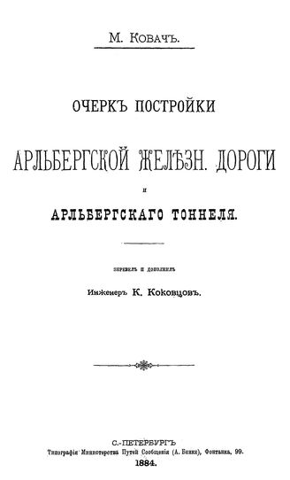 Ковач М. Очерк постройки алльбергской железн. дороги и арльбергского тоннеля / М. Ковач, 1884. - 54 с.