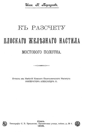 Терпугов Н. К расчету плоского железного настила мостового полотна : оттиск из Известий Киевского политех. ин-та Императора Александра II / Н. Терпугов, 1908. - 65 с.