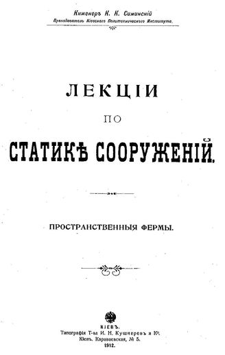 Симинский К. К. Лекции по статике сооружений. Пространственные фермы. - Киев, 1912.
