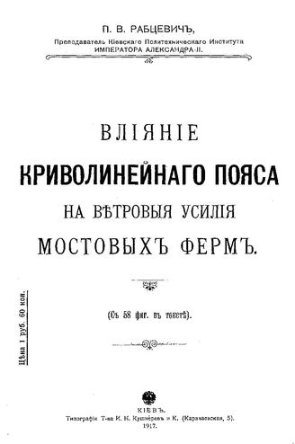 Рабцевич П. В. Влияние криволинейного пояса на ветровые усилия мостовых ферм / П. В. Рабцевич, 1917. - 63 с.