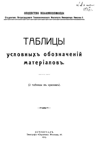 Таблицы условных обозначений материалов / О-во взаимопомощи студентов Петроград. технолог. ин-та Императора Николая I, 1915. - 3 л с.