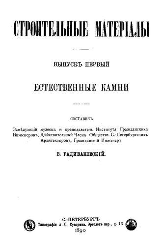 Радивановский В. Строительные материалы. Вып. 1 : Естественные камни. - СПб., 1890.