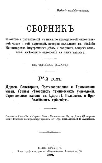 Сборник законов и разъяснений к ним по гражданской строительной части и той дорожной, которая находится в ведении Министерства внутренних дел, и сборник общих законов, имеющих отношение к сим частям : в 4-х т. Т. 4 : Дороги. Санитарная, противопожарная и техническая части. Уставы некоторых технических учреждений. Строительные законы в Царстве Польском и Прибалтийских губерниях / сост. З. В. Зосимовский, 1901. - 889 889 с.