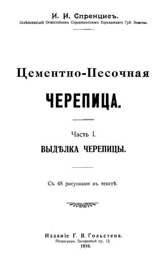 Цементно-песочная черепица И. И. Спренцис. Ч. 1 : Выделка черепицы. - Петроград, 1916.