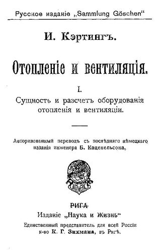 Отопление и вентиляция : авторизованный перевод с последнего немецкого издания инженера Б. Каценельсона / И. Кэртинг. I. : Сущность и расчет оборудования отопления и вентиляции, Б.г. - 180 с.