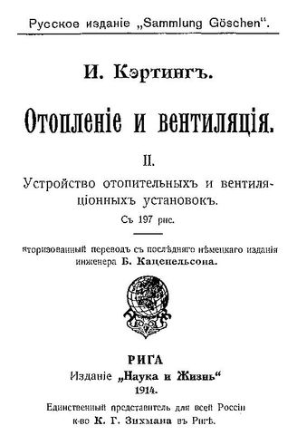 Отопление и вентиляция И. Кэртинг. II. : Устройство отопительных и вентиляционных установок. - Рига, 1914.