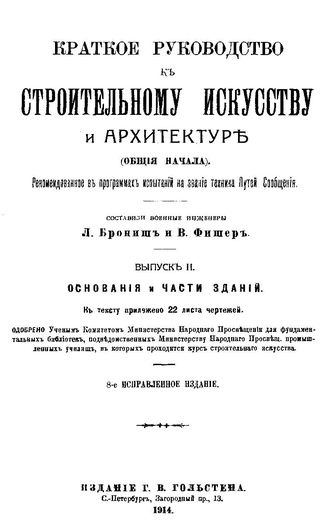 Краткое руководство к строительному искусству и архитектуре. (Общие начала) / сост. Л. Брониш, Фишер В. Вып. 2 : Основания и части зданий, 1914. - 205 с.