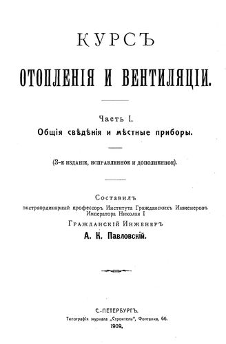 Курс отопления и вентиляции сост. А. К. Павловский. Ч. 1 : Общие сведения и местные приборы. - СПб., 1909.