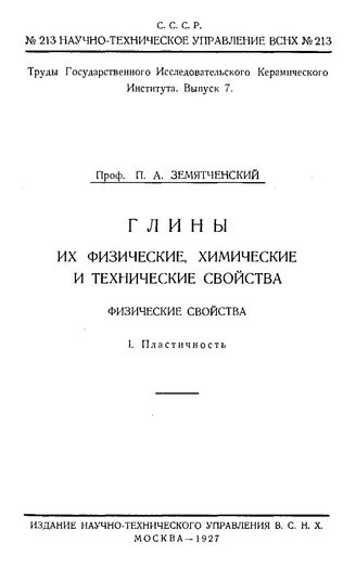 Труды Государственного исследовательского керамического института. Вып. 7 : Глины их физические, химические и технические свойства. Физические свойства, 1. Пластичность / П. А. Земятченский, 19. - 84.