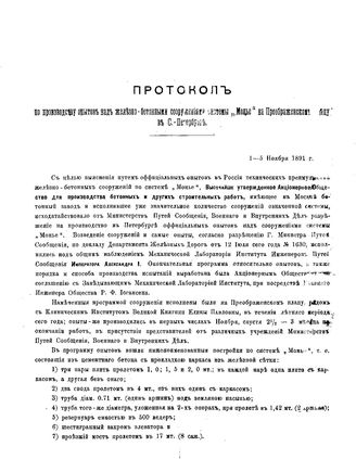 Протокол по производству опытов над железно-бетонными сооружениями системы "Монье" на Преображенском плацу в С.-Петербурге, 1891. - 18 с.