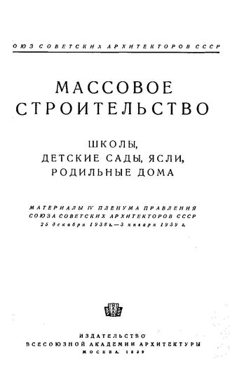 Массовое строительство. Школы, детские сады, ясли, родильные дома : материалы IV пленума Правления Союза советск. архитекторов СССР, 25 декабря 1938 г. - 3 января 1939 г., 1939. - 178 с.