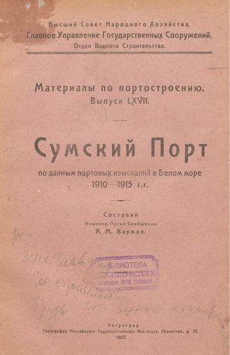 Труды Отдела торговых портов / Россия. Главное упр. торгового мореплавания и портов, Отдел торговых портов. Вып. 67 : Сумский порт : по данным портовых изысканий на Белом море 1910-1915 г.г. / сост. А. М. Вихман, 1922. - 63 с.