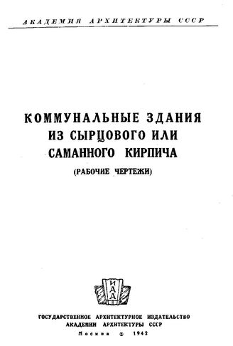 Строительство поселков из саманного и сырцового кирпича силами населения : серия / Академия архитектуры СССР. Вып. 3 : Коммунальные здания из сырцового или саманного кирпича. Столовая. Продовольственный магазин. Хлебопекарня. Больница. Амбулатория. Баня : рабочие че5ртежи, 1942. - 66 с.