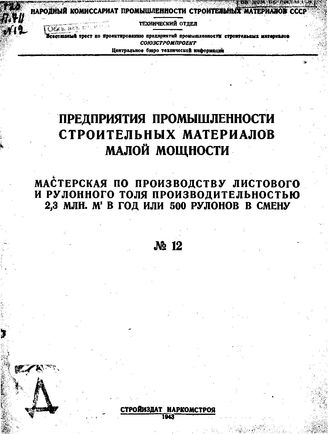 Предприятия промышленности строительных материалов малой мощности. № 12 : Мастерская по производству листового и рулонного толя производительностью 2,3 млн. м2 в год или 500 рулонов в смену, 1943. - 46 с.