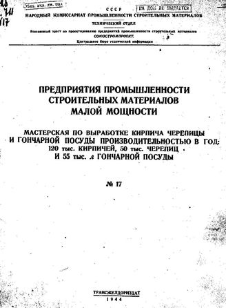Предприятия промышленности строительных материалов малой мощности. № 17 : Мастерская по выработке кирпича черепицы и гончарной посуды производительностью в год: 120 тыс. кирпичей, 50 тыс. черепиц и 55 тыс. л гончарной посуды, 1944. - 32 с.