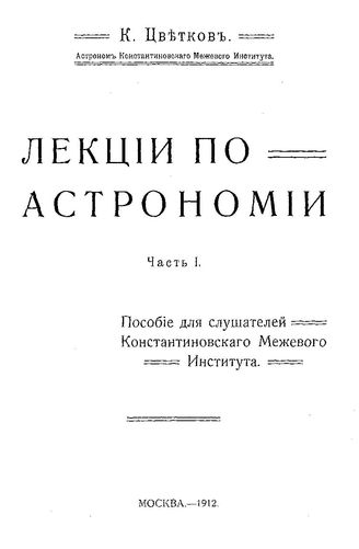 Лекции по астрономии : пособие для слушателей Константиновского межевого ин-та / К. Цветков. Ч. 1, 1912. - 163 III с.