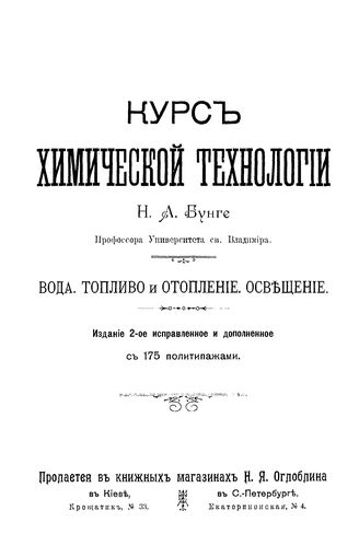 Бунге Н.А. Курс химической технологии. Вода. Топливо и отопление. Освещение / Н. А. Бунге, 1905. - 390 с.