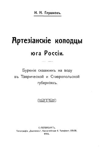 Глушков И.Н. Артезианские колодцы юга России. Бурение скважин на воду в Таврической и Ставропольской губерниях / И. Н. Глушков, 1914. - 45 с.