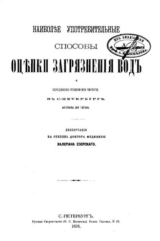 Езерский В. Наиболее употребительные способы оценки загрязнения вод и определение степени их чистоты в С.-Петербурге. - СПб., 1876.