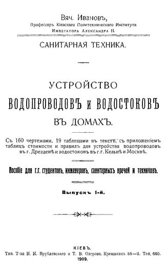 Устройство водопроводов и водостоков в домах Иванов В. Вып. 1. - Киев, 1909.