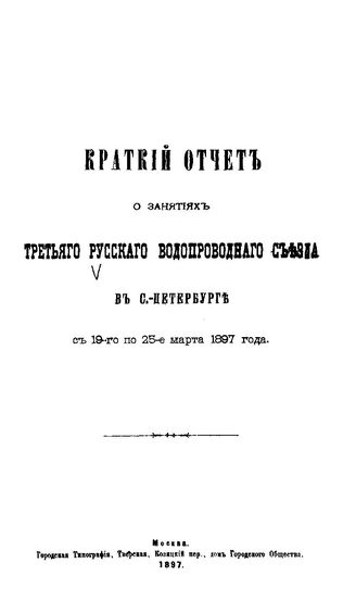 Краткий отчет о занятиях третьего Русского водопроводного съезда в С.-Петербурге с 19-го по 25-е марта 1897 года. - М., 1897.