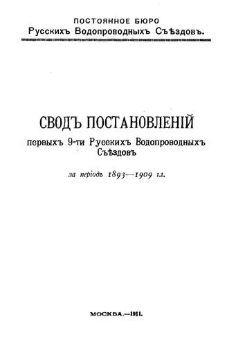 Свод постановлений первых 9-ти Русских водопроводных съездов за период 1893 - 1909 гг. - М., 1911.