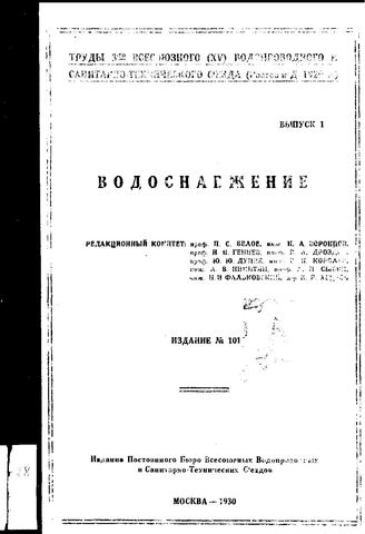 Белов П.С., Воронцов Н.А., Гениев Н. Н. Водоснабжение. - М., 1930.