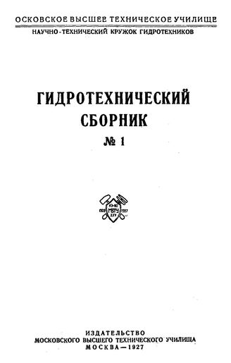 Гидротехнический сборник / Московское высшее техническое училище. № 1 / ред. кол.: Е. В. Близняк (отв. ред.) и др., 1927. - 103 с.