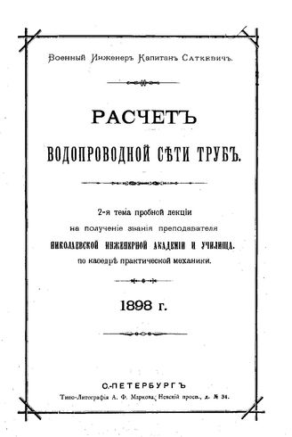 Саткевич А. Расчет водопроводной сети труб : 2-я тема пробной лекции на получение звания преподавателя Николаев. инж. акад. и Училища по кафедре практ. механики / А. Саткевич, 1898. - 55 с.