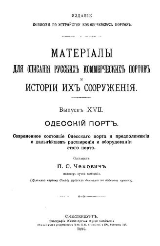 Материалы для описания русских портов и истории их сооружения / Комис. по устройству коммер. портов. Вып. 17 : Одесский порт. Современное состояние Одесского порта и предложения о дальнейшем расширении и оборудовании этого порта / сост. П. С. Чехович, 1895. - 3,218,III c. с.