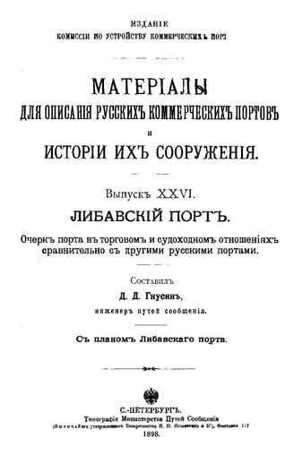 Гнусин Д.Д. Материалы для описания русских портов и истории их сооружения Комис. по устройству коммер. портов. Вып. 26 : Либавский порт. Очерк порта в торговом и судоходном отношениях сравнительно с другими русскими портами. - СПб., 1898.