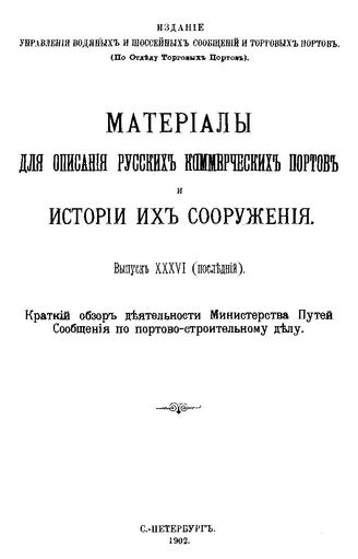 Материалы для описания русских портов и истории их сооружения / Комис. по устройству коммер. портов. Вып. 36 : Краткий обзор деятельности Министерства путей сообщения по портово-строительному делу, 1902. - 51 с.