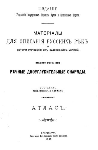 Материалы для описания русских рек и истории улучшения их судоходных условий. - (Издание Управления внутренних водных путей и шоссейных дорог). Вып. 3 : Речные дноуглубительные снаряды : атлас / сост. А. Борман, 1903. - IV с.,75 л.
