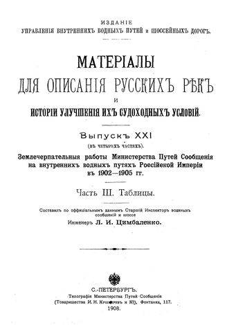 Материалы для описания русских рек и истории улучшения их судоходных условий / Россия. М-во путей сообщения. - (Издание Управления внутренних водных путей и шоссейных дорог). Вып. 21 : Землечерпательные работы Министерства путей сообщения на внутренних водных путях Российской Империи в 1902-1905 гг, Ч. 3. Таблицы / сост. Л. И. Цимбаленко, 19. - XLV, 399 с.