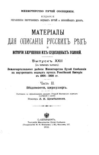 Цимбаленко Л.И. Материалы для описания русских рек и истории улучшения их судоходных условий Россия. Вып. 22 : Землечерпательные работы Министерства путей сообщения на внутренних водных путях Российской Империи в 1906-1908 гг, Ч. 2.. - СПб., 19.