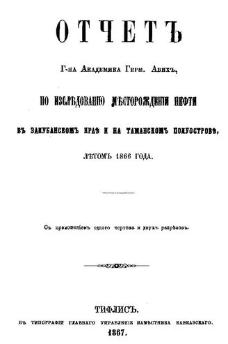 Авих Г. Отчет по исследованию месторождений нефти в Закубанском крае и на Таманском полуострове летом 1866 года [Электронный ресурс] : отчет / Г. Авих, 1867. - 25 с.